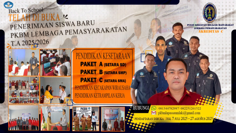 Saumlaki, mediatifatanimbar.id – PKBM (Pusat Kegiatan Belajar Masyarakat) Lembaga Pemasyarakatan (Lapas) Saumlaki Kabupaten Kepulauan Tanimbar kembali membuka pendaftaran untuk Tahun Ajaran (TA) baru – 2025/2026.