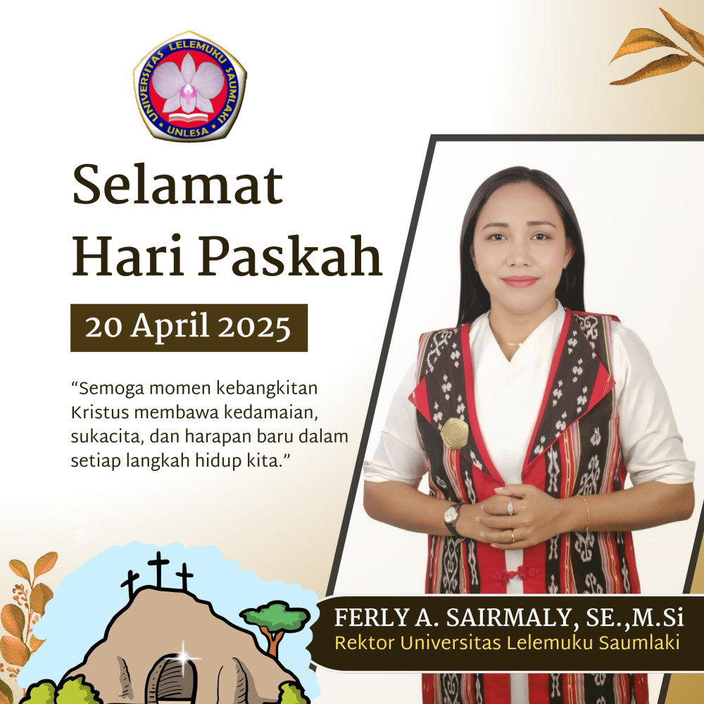 FERLY A. SAIRMALY, SE., M.Si REKTOR UNIVERSITAS LELEMUKU SAUMLAKI KABUPATEN KEPULAUAN TANIMBAR Mengucapkan Selamat Memperingati PASKAH KEBANGKITAN KRISTUS TUHAN…