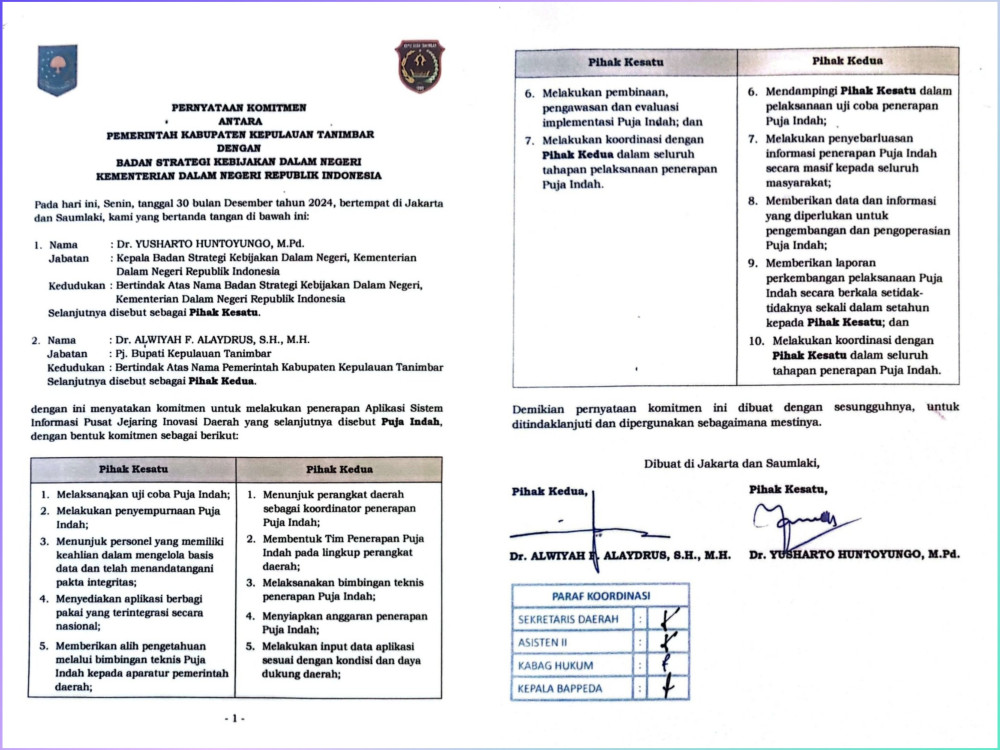 “Pelaksanan Bimtek hari ini adalah kelanjutan dari penandatangan komitmen tentang penerapan Aplikasi PUJA INDAH antara Kepala Badan Strategi Kebijakan Dalam Negeri (BSKDN) Kemendagri, Dr. Yusharto Huntoyungo, M.Pd., dan Pemkab Tanimbar (Dr. Alawiyah F. Alaydrus, SH, MH – Pejabat Bupati Tanimbar saat itu) bertempat di Jakarta dan Saumlaki, Senin, 30 Desember 2024,” jelasnya.