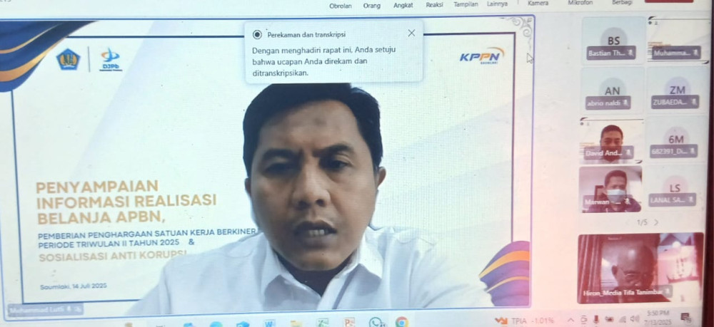 Saumlaki, mediatifatanimbar.id – Kantor Pelayanan Perbendaharaan Negara (KPPN) Tipe A2 Saumlaki menggelar kegiatan penyampaian realisasi Anggaran Pendapatan dan Belanja Negara (APBN) Triwulan II Tahun 2025 secara daring, Senin (14/07/2025), pukul 09.00 WIT.