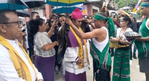 Amdasa, mediatifatanimbar.id- Uskup Diosis Amboina, Seno Ngutra didampingi para Pastores diterima secara adat oleh tetua adat desa Amdasa dalam rangka pengresmian dan pentahbisan gedung Gereja Katolik Stasi Santa Bunta Allah desa Amdasa – Kepulauan Tanimbar – Maluku, Sabtu 28/12/2024 pkl 15.04 WIT.