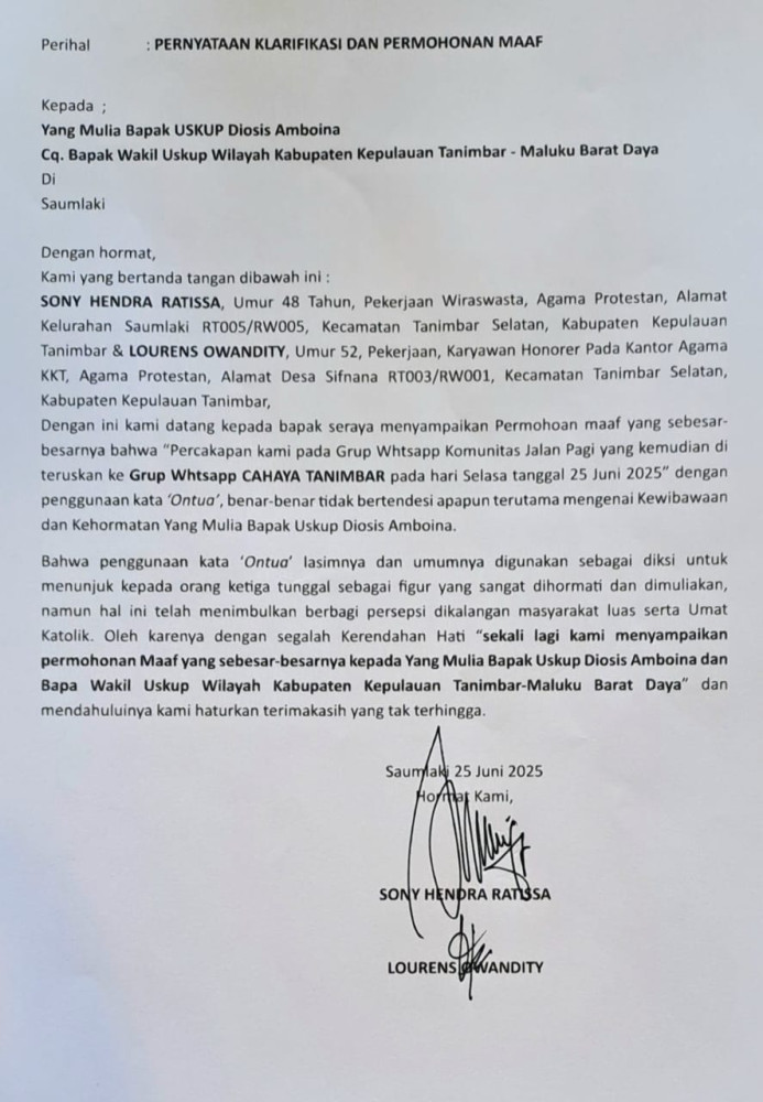 “Dengan ini kami datang kepada Bapak seraya menyampaikan permohonan maaf yang sebesar-besarnya bahwa percakapan kami pada grup WhatsApp Komunitas Jalan Pagi yang kemudian diteruskan ke grup WhatsApp Cahaya Tanimbar pada hari Selasa tanggal 24 Juni 2025 dengan penggunaan kata ‘Ontua’ benar-benar tidak bertendensi apapun terutama mengenai kewibawaan dan kehormatan Yang Mulia Bapak Uskup Diosis Amboina,” demikian bunyi pernyataan Sony.